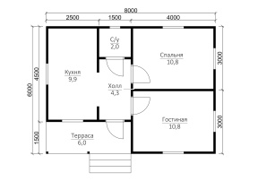 Дом общей площадью 45 кв.м. и размерами 6х8 м. может быть выполнен в нескольких вариантах: под усадку и под ключ. Возможно использование профилированного бруса разного сечения: 90х140 мм и 140х140 мм.